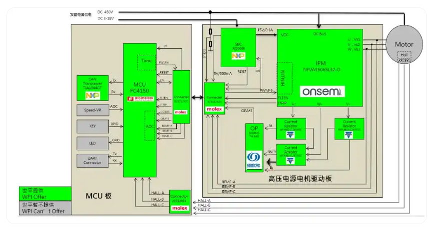 在电机驱动部分,方案采用集成预驱与6颗IGBT管的IPM来做电机的电子换相控制。核心芯片采用的是onsemi旗下的NFVA35065L32-D。该芯片内置3个高速半桥高压栅极驱动电路,集成了(650V/50A)低损耗的IGBT管,最大支持20KHz的PWM,并且还提供包括欠电压锁定、过电流锁定、驱动与集成电路的温度监测和故障报告等多个模块保护功能,能够为汽车电机应用提供卓越性能。